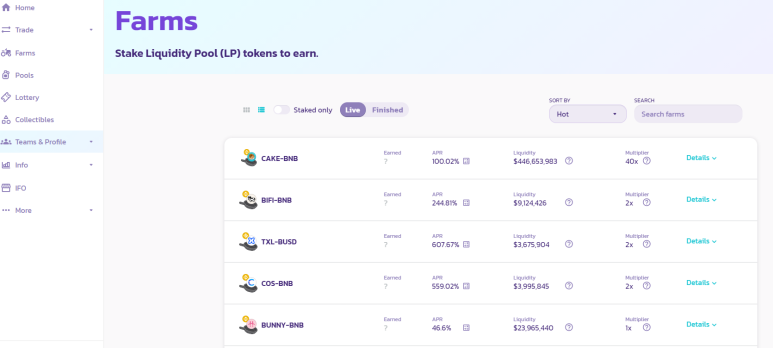 위 사진은 바이넨스스마트체인(Binance Smart Chain)에 있는 팬케이크스왑(CAKE) DEX 거래소 입니다. 팬케이크 DEX에는 무수히 많은 유동성풀이 있습니다.