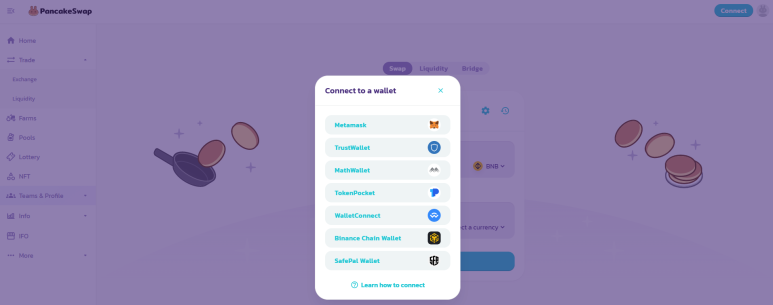 * 유동성 제공시 개인지갑 연결화면 출처 https://exchange.pancakeswap.finance/#/swap