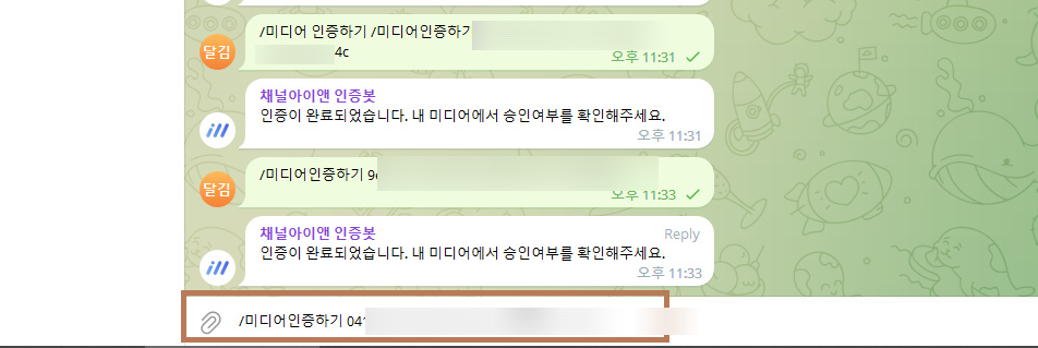 * 텔레그램 방에서 미디어 인증하기 화면