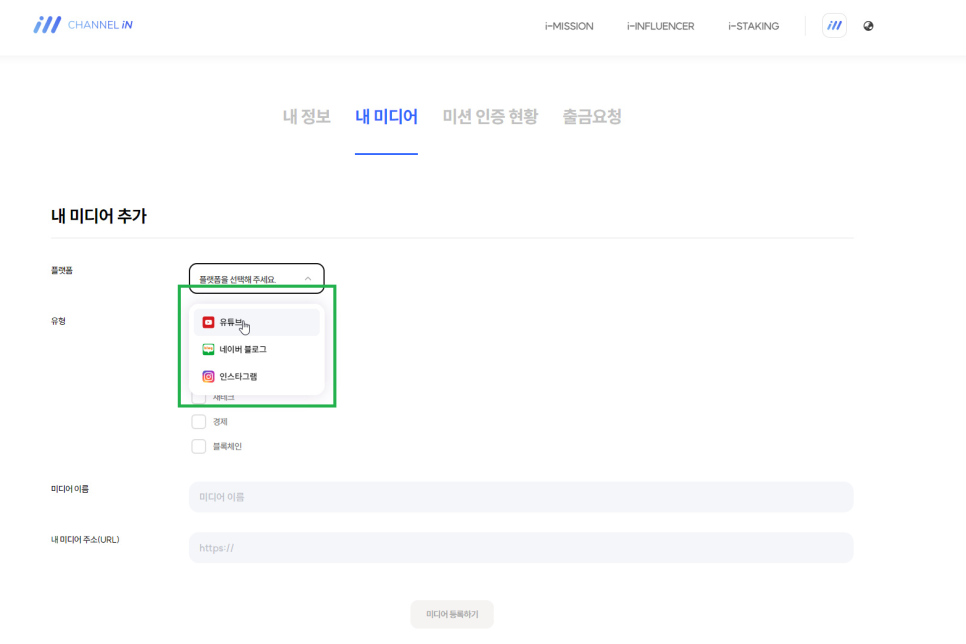 4. 플랫폼 --> 원하는 미디어 선택 (유튜브, 인스타 또는 블로그) 및 기타사항 입력 --> 하단 미디어등록하기 클릭