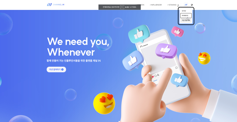 채널아이앤은 퍼프로젝트에서 진행중인 광고플랫폼 입니다. 인플루언서가 유튜브, 블로그를 통해 주어진 미션을 수행하고 NFT를 수령한 후 스테이킹 하여 보상을 받습니다. 채널아이앤 인플류언서로 활동하려면 미디어를 등록해야 합니다.