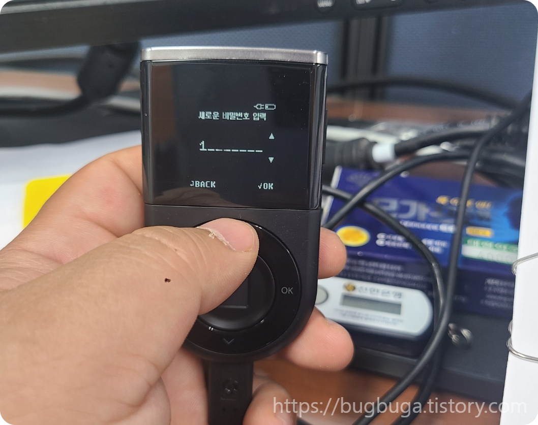 이부분에서 약간 초보자가 어렵다면 어려울수 있거나 귀찮습니다. 상/하 버튼을 눌러 원하는 숫자 지정후 오른쪽"OK"버튼으로 확정하면 다음 숫자로 넘어 갑니다. 비번은 4자리부터 8자리까지 입력가능합니다. 귀찮아서 4자리까지만 입력하고 8번 자리까지 "OK"를 눌러 확인하며 4자리로 설정도 가능합니다. 단지 4자리 설정의 경우 "보안이 낮다고" 문구가 나올수 있습니다.