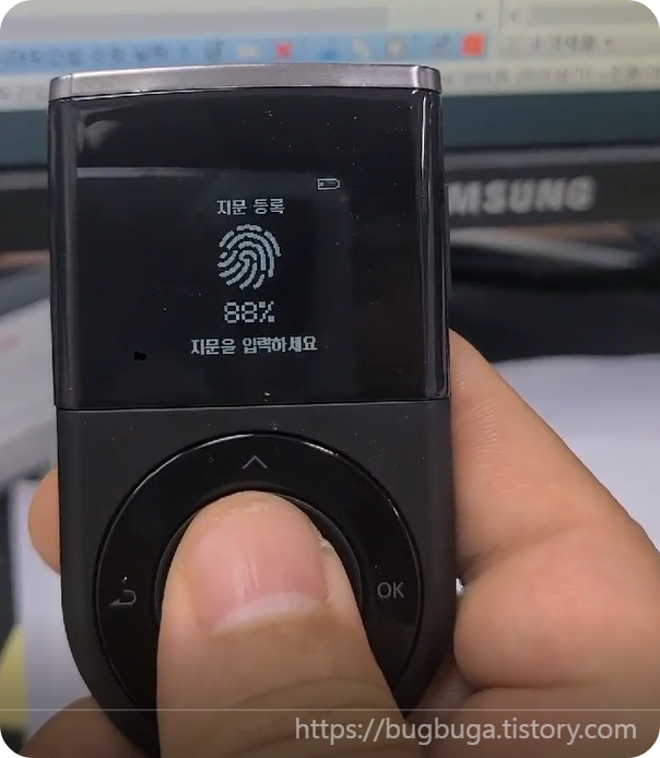 지문센서 위치를 잘 파악하시고 같은 손가락을 100%가 될때까지 조금씩 옮겨하며 터치 합니다. (약 8회). 지문인식 완료후 지문이 잘 등록되었는지 등록 재확인을 합니다.