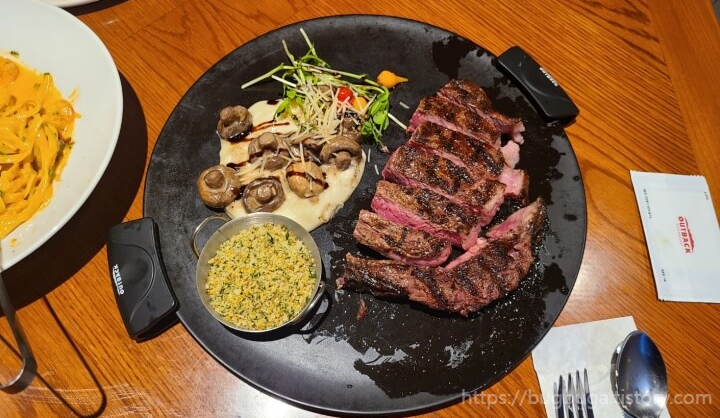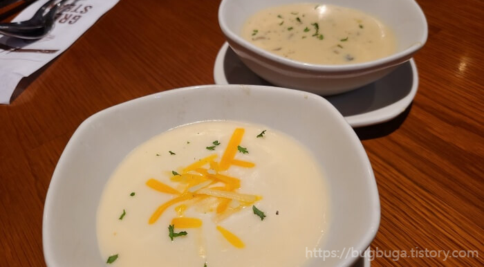 기다리던 메인 메뉴가 나왔습니다. 토마호크 820g과 스파이시 투움바 파스타 그리고 스파클링 음료가 나왔습니다. 오지감자칩은 주문하고 싶었으나 양이 너무 많을것 같아 하지 않았습니다. 스테이크를 주문하면 처음에 스프가 나옵니다. 다른 두 종류의 스프입니다만 명칭이 생각이..ㅎㅎ. 스테이크는 매니져분이 설명과 함께 직접 커팅 후 플레이팅해 주십니다.