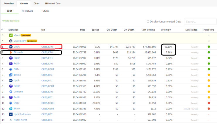 이런 오브스를 어디서 구매 할수 있는지 알아 보겠습니다. 위 사진과 같이 빗썸, 업비트 두 국내 거래소에서 거의 99%의 거래가 이루어 지고 있습니다. 아래 거래 볼륨이 작은 업비트 인도네시아, 코인베이스 등 다른 국내 거래소도 있지만 거래량이 적으면 유동성 부족으로 거래 체결이 어렵습니다.