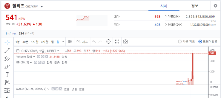 위에 업비트 칠리즈 월봉입니다. 지난해 4월 1일 기준 한화 12원에서 현재 기준 584원을 기록하고 있습니다. 정말로 어마무시 합니다. 가격보다는 축구를 좋아하는 팬이라면 자신이 원하는 음악을 골 득점시 틀수 있는 것이 더 좋겠지요?
